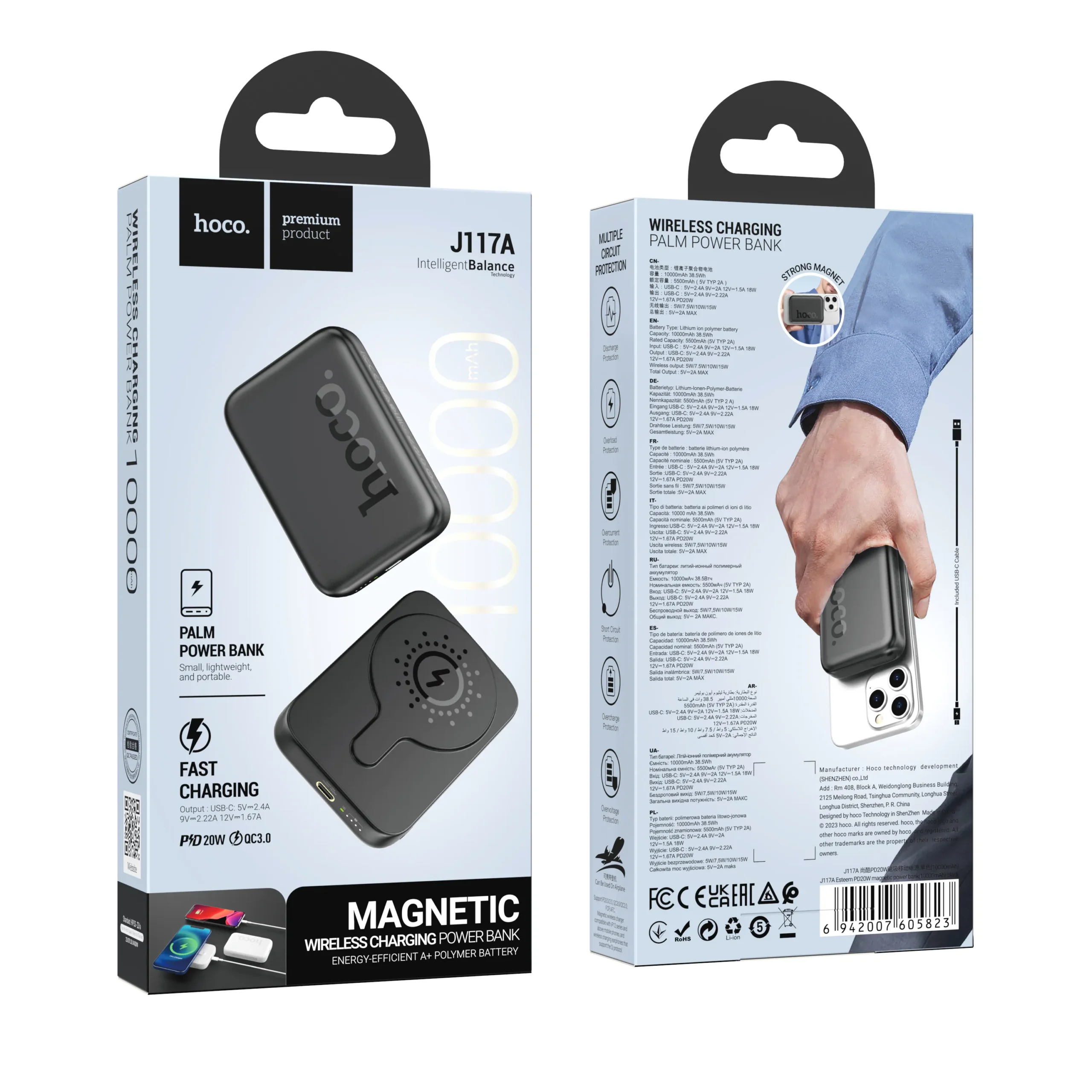 Made with ABS+PC flame-retardant shell and a lithium polymer cell, the Hoco J117A is:
